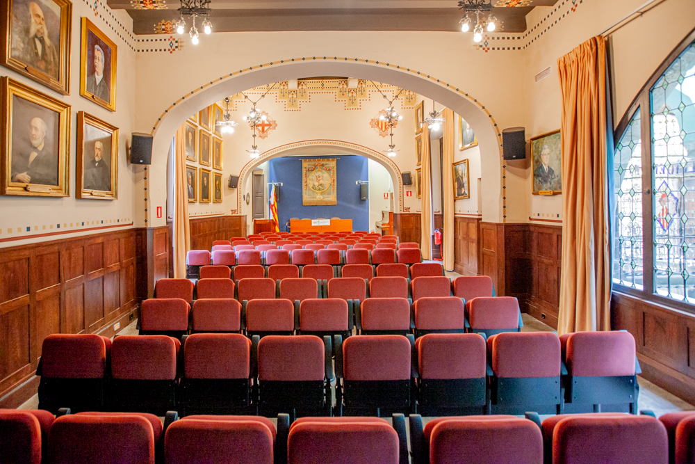 La construcció d'una sala d'actes espaiosa fou una de les peticions que els excursionistes feren a l'arquitecte, que resolgué ajuntant tres sales que agafen tota l'amplada del solar, afegint-hi l'espai que ocupava el celobert situat a l’actual sala de juntes, que fou suprimit. El diferent nivell dels tres sostres es dissimula enginyosament gràcies a la diferent llargada de les tiges dels llums penjats del sostre, que queden així unificats a un mateix nivell. La llarga tija dels llums del sector central sorprengué a alguns i motiva qualificatius humorístics com el de «colis de girafa». Un problema que calia resoldre era la comunicació entre la sala d'actes i la resta del local social, salvant l'aïllament provocat per haver-hi entremig el pati de les columnes.