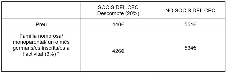 - NO SOCIS/ES DEL CEC: 551€ (fes-te soci/a des de 36€/any i gaudeix de tots els avantatges del CEC!)
